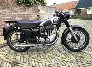 1953 A.J.S. 16MS Doordat op het achterspatbord het originele dealerplaatje nog aanwezig is, was, na enig speurwerk, de zo goed als volledige geschiedenis van deze A.J.S. te achterhalen. Op zich redelijk uniek. In 1953 werd deze A.J.S. door Garagebedrijf Doornbos & Zoons te Siddeburen verkocht aan de eerste eigenaar, de heer Hendrikse. Hendrikse gebruikte de motorfiets nauwelijks en stalde de motorfiets bijna dertig jaar lang in de etalage van een autodealer. Uiteindelijk werd de motorfiets begin jaren 80 verkocht aan de heer Van Keulen die de A.J.S. gebruikte als hobby motor. Als het winter was, werd de motorfiets in het huis gestald. Na 18 jaar ruilde Van Keulen zijn A.J.S. in voor een Harley Davidson. Daarna is de geschiedenis iets minder duidelijk. Het verhaal is dat de A.J.S. in het circuit van de autohandel terecht kwam, waar de motorfiets een aantal malen als inruilobject gebruikt is. Uiteindelijk gebruikte een autodealer de A.J.S., die inmiddels niet meer kon rijden, thuis als sierobject in zijn mancave. In 2008 kocht de huidige eigenaar de A.J.S. van deze autodealer. Er stond toen slechts ± 8000km. op de kilometerteller. Doordat er in al die jaren zo weinig mee gereden was, moest er wel een aantal onderdelen vervangen worden, maar qua lak en chroom en algehele uitvoering is deze A.J.S. nog steeds een tijdcapsule. De huidige eigenaar gebruikt de A.J.S. regelmatig. In 2023 stond er ruim 39000 km. op de kilometerteller. A.J.S. en Matchless In 1897 begon de familie Stevens in Wolverhampton met de fabricage van motorfietsen. Eerst onder de naam Stevens en ook, door de samenwerking met Wearwell, onder de naam Wearwell-Stevens. In 1909 werd de naam A.J.S. voor het eerst gebruikt. Intussen was in 1901 de familie Collier in Londen begonnen met de productie van Matchless motorfietsen. De eerste modellen van beide merken waren tamelijk primitief, maar door de snelle technische ontwikkelingen aan het begin van de twintigste eeuw werden de motorfietsen steeds beter. A.J.S. en Matchless ontwikkelden zich tot leidende merken in de Britse motorfietsindustrie. De vele modellen ééncilinder en V-twin motorfietsen werden goed verkocht en beide merken kwamen geregeld met innovatieve ontwerpen. Ook in de motorsport werden door beide merken grote successen behaald. A.J.S. ging naast motorfietsen ook radio-ontvangers, autobussen en auto’s produceren. Tijdens de Grote Depressie die begon in oktober 1929, werd deze expansie A.J.S. fataal. A.J.S moest faillissement aanvragen en eind 1931 werd de motorfiets tak van A.J.S. overgenomen door Matchless. Tot de Tweede Wereldoorlog werden beide merken naast elkaar geproduceerd, maar tijdens de Tweede Wereldoorlog werd alleen nog de 350cc Matchless ééncilinder gefabriceerd voor de Engelse War Office. Na de Tweede Wereldoorlog werden er weer A.J.S en Matchless motorfietsen geproduceerd, maar er was nu sprake van “badge engineering”. A.J.S. en Matchless waren identiek. Slechts in kleur, tankemblemen en kleine details verschilden ze van elkaar. Beide merken verkochten goed en ook in de motorsport werden weer successen behaald, zowel op de weg als in het terrein. Eind jaren ’60 viel door stagnerende ontwikkeling en slecht management voor zo’n beetje de hele Britse motorfietsindustrie het doek. Ook voor A.J.S. en Matchless.